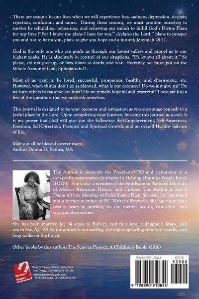 There are seasons in our lives when we will experience loss, sadness, depression, despair, rejection, confusion, and more. During these seasons, we must position ourselves to survive by rebuilding, refocusing, and renewing our minds to fulfill God's Divine Plans for our lives ("For I know the plans I have for you," declares the Lord," plans to prosper you and not to harm you, plans to give you hope and a future); Jeremiah 29:11. God is the only one who can guide us through our lowest valleys and propel us to our highest peaks. He is absolutely in control of our situations, "He knows all about it." So please, do not give up, or bow down to doubt and fear. Everyday, we must put on the Whole Armor of God; Ephesians 6:11. Most of us want to be loved, successful, prosperous, healthy, and charismatic, etc. However, when things don't go as planned, what is our recourse? Do we just give up? Do we hurt others because we are hurt? Do we remain hopeful and prayerful? These are just a few of the questions that we must ask ourselves. This journal is designed to be your recourse and navigation as you encourage yourself to a joyful place in the Lord. Upon completing your journey, by using this journal as a tool, it is my prayer that God will give you the following: Self-Empowerment, Self-Awareness, Freedom, Self-Direction, Personal and Spiritual Growth, and an overall Healthy balance of life. May you all be blessed forever more, Author Donna D. Bethea, MA