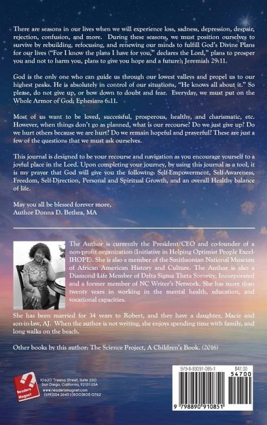There are seasons in our lives when we will experience loss, sadness, depression, despair, rejection, confusion, and more. During these seasons, we must position ourselves to survive by rebuilding, refocusing, and renewing our minds to fulfill God's Divine Plans for our lives ("For I know the plans I have for you," declares the Lord," plans to prosper you and not to harm you, plans to give you hope and a future); Jeremiah 29:11. God is the only one who can guide us through our lowest valleys and propel us to our highest peaks. He is absolutely in control of our situations, "He knows all about it." So please, do not give up, or bow down to doubt and fear. Everyday, we must put on the Whole Armor of God; Ephesians 6:11. Most of us want to be loved, successful, prosperous, healthy, and charismatic, etc. However, when things don't go as planned, what is our recourse? Do we just give up? Do we hurt others because we are hurt? Do we remain hopeful and prayerful? These are just a few of the questions that we must ask ourselves. This journal is designed to be your recourse and navigation as you encourage yourself to a joyful place in the Lord. Upon completing your journey, by using this journal as a tool, it is my prayer that God will give you the following: Self-Empowerment, Self-Awareness, Freedom, Self-Direction, Personal and Spiritual Growth, and an overall Healthy balance of life. May you all be blessed forever more, Author Donna D. Bethea, MA