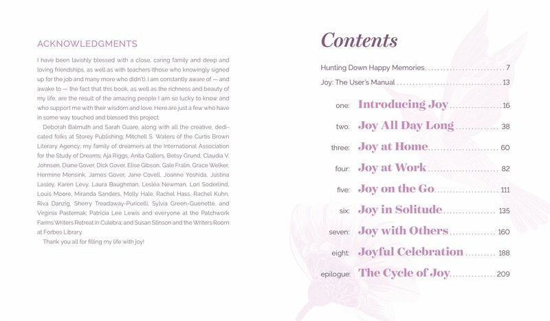 Hunting Down Happy Memories Joy: The User's Manual 1: Introducing Joy 2: Joy All Day Long 3: Joy at Home 4: Joy at Work 5: Joy on the Go 6: Joy in Solitude 7: Joy with Others 8: Joyful Celebration Epilogue: The Cycle of Joy