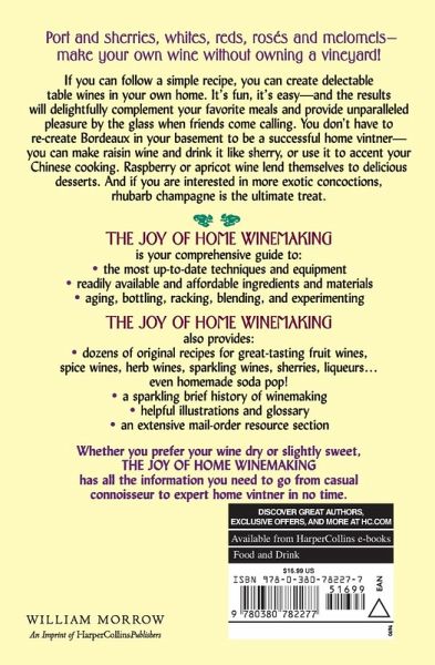 Port and sherries, whites, reds, roses and melomels?make your own wine without owning a vineyard! If you can follow a simple recipe, you can create delectable table wines in your own home. It's fun, it's easy-and the results will delightfully complement your favorite meals and provide unparalleled pleasure by the glass when friends come calling. You don't have tore-create Bordeaux in your basement to be a successful home vintner-you can make raisin wine and drink it like sherry, or use it to accent your Chinese cooking. Raspberry or apricot wine lend themselves to delicious desserts. And if you are interested in more exotic concoctions, rhubarb champagne is the ultimate treat. The Joy of Home Winemaking is your comprehensive guide to: * the most up-to-date techniques and equipment * readily available and affordable ingredients and materials * aging, bottling, racking, blending, and experimenting * dozens of original recipes for great-tasting fruit wines, * spice wines, herb wines, sparkling wines, sherries, liqueurs * even homemade soda pop! * a sparkling brief history of winemaking * helpful illustrations and glossary * an extensive mail-order resource section Whether you prefer your wine dry of slightly sweet, The Joy of Home Winemaking has all the information you need to go from casual connoisseur to expert home vintner in no time.