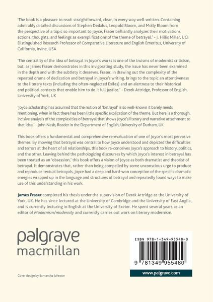 This book offers a fundamental and comprehensive re-evaluation of one of Joyce's most pervasive themes. By showing that betrayal was central to how Joyce understood and depicted the difficulties and terrors at the heart of all relationships, this book re-conceives Joyce's approach to history, politics, and the other. Leaving behind the pathologizing discourses by which Joyce's interest in betrayal has been treated as an 'obsession,' this book offers a vision of Joyce as both dramatist and theorist of betrayal. It demonstrates that, rather than being compelled by some unconscious urge to produce and reproduce textual betrayals, Joyce had a deep and hard-won conception of the specific dramatic energies wrapped up in the language and structures of betrayal and repeatedly found ways to make use of this understanding in his work.
