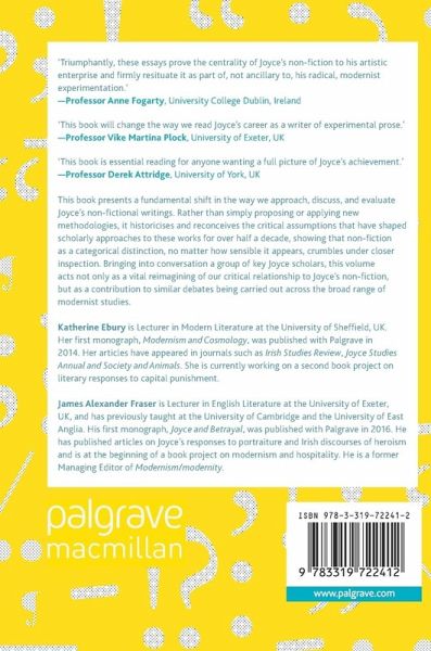 This book presents a fundamental shift in the way we approach, discuss, and evaluate Joyce's non-fictional writings. Rather than simply proposing or applying new methodologies, it historicises and reconceives the critical assumptions that have shaped scholarly approaches to these works for over half a century, showing that non-fiction as a categorical distinction, no matter how sensible it appears, crumbles under closer inspection. Bringing into conversation a group of key Joyce scholars, this volume acts not only as a vital reimagining of our critical relationship to Joyce's non-fiction, but as a contribution to similar debates being carried out across the broad range of modernist studies.