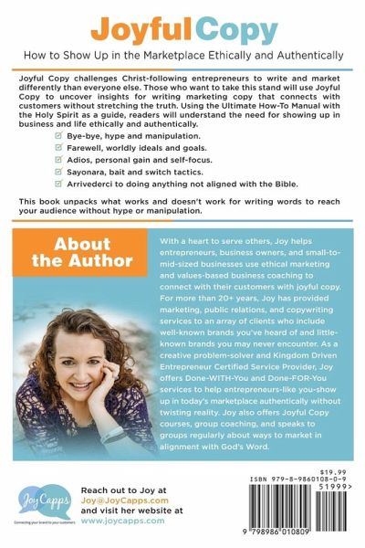 Joyful Copy provides entrepreneurs, small business owners, and marketers insights and frameworks to write copy that builds connections with customers without twisting reality. Written for those already working and living life as Christ-following entrepreneurs, Joyful Copy will benefit anyoneno matter what they believe or do for a living. Readers will discover new-to-you insights or old ideas from a different perspective that has the potential to positively impact the lives and businesses of those who apply them. Using the Ultimate How-To Manual with Holy Spirit as a guide, readers will come to understand the need for taking a stand and showing up in today's marketplace ethically and authentically.Bye-bye, hype and manipulation. Farewell, worldly ideals and goals. Adios, personal gain and self-focus. Sayonara, bait and switch tactics. Arrivederci to doing anything not aligned with the Bible. This book unpacks what works and doesn't work for writing words to reach your audience without hype and manipulation.