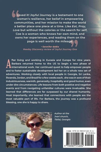 Dr. Barbara A. Coe began to work internationally in 1995 to help foster community empowerment and sustainable development. She lived and worked overseas for years. Then, in 2009, she returned to the United States to begin a new phase, conducting short-term projects in countries including Georgia, Rwanda, Sri Lanka, Brazil, Jordan, and others. Many of the people with whom she worked had experienced great pain and suffering yet showed great resiliency and commitment to improving their conditions. Without exception, even when their circumstances were dire, people were warm, hospitable, and good natured. As Barbara navigated unfamiliar terrain, languages, and customs, both positive events and challenges continued her life lessons. She often saw how her own thinking sometimes led her astray but prompted her to refocus on her goals and keep advancing. She went to teach, but experienced profound learning. Most importantly, she learned that connections with people are the most valuable part of life and that cultural differences are far surpassed by our shared humanity. In this account, laced with wry humor, she takes you along to places less traveled to share the experience. For Barbara, this was another Joyful Journey for which she is deeply grateful.