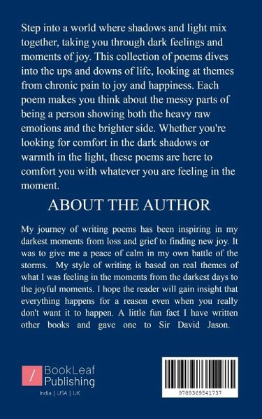 Step into a world where shadows and light mix together, taking you through dark feelings and moments of joy. This collection of poems dives into the ups and downs of life, looking at themes from chronic pain to joy and happiness. Each poem makes you think about the messy parts of being a person showing both the heavy raw emotions and the brighter side. Whether you're looking for comfort in the dark shadows or warmth in the light, these poems are here to comfort you with whatever you are feeling in the moment.