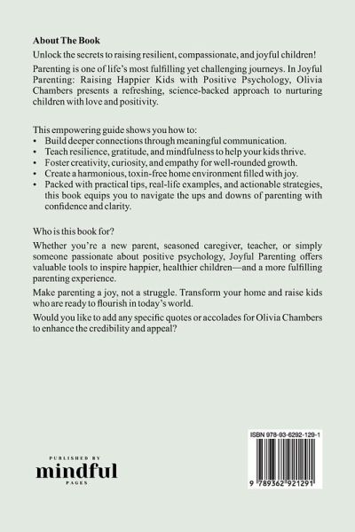 Unlock the secrets to raising resilient, compassionate, and joyful children! Parenting is one of life's most fulfilling yet challenging journeys. In Joyful Parenting: Raising Happier Kids with Positive Psychology, Olivia Chambers presents a refreshing, science-backed approach to nurturing children with love and positivity. This empowering guide shows you how to: Build deeper connections through meaningful communication. Teach resilience, gratitude, and mindfulness to help your kids thrive. Foster creativity, curiosity, and empathy for well-rounded growth. Create a harmonious, toxin-free home environment filled with joy. Packed with practical tips, real-life examples, and actionable strategies, this book equips you to navigate the ups and downs of parenting with confidence and clarity. Who is this book for? Whether you're a new parent, seasoned caregiver, teacher, or simply someone passionate about positive psychology, Joyful Parenting offers valuable tools to inspire happier, healthier children-and a more fulfilling parenting experience. Make parenting a joy, not a struggle. Transform your home and raise kids who are ready to flourish in today's world. Would you like to add any specific quotes or accolades for Olivia Chambers to enhance the credibility and appeal?