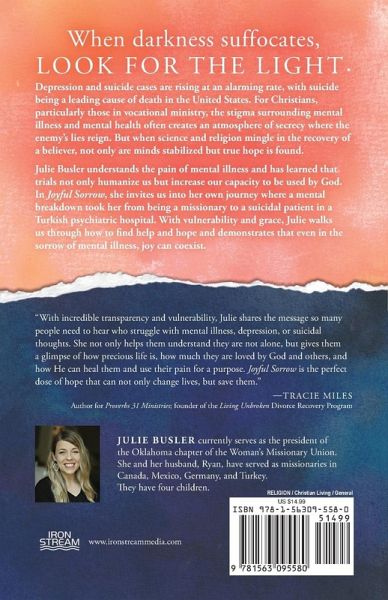 When darkness suffocates, look for the light. Depression and suicide cases are rising at an alarming rate, with suicide being a leading cause of death in the United States. For Christians, particularly those in vocational ministry, the stigma surrounding mental illness and mental health often creates an atmosphere of secrecy where the enemy's lies reign. But when science and religion mingle in the recovery of a believer, not only are minds stabilized but true hope is found. Julie Busler understands the pain of mental illness and has learned that trials not only humanize us but increase our capacity to be used by God. In Joyful Sorrow, she invites us into her own journey where a mental breakdown took her from being a missionary to a suicidal patient in a Turkish psychiatric hospital. With vulnerability and grace, Julie walks us through how to find help and hope and demonstrates that even in the sorrow of mental illness, joy can coexist.