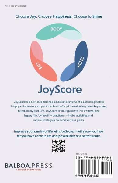 JoyScore is a self-care and happiness improvement book designed to help you increase your personal level of Joy by evaluating 3 key areas - Mind, Body and Life. JoyScore is your guide to live a stress-free, happy life by healthy practices, mindful activities and simple strategies, to achieve your goals.