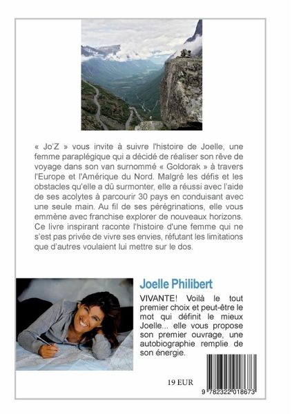 "Jo'Z" vous invite à suivre l'histoire de Joelle, une femme paraplégique qui a décidé de réaliser son rêve de voyage en conduisant son van surnommé "Goldorak" à travers l'Europe et l'Amérique du Nord.Malgré les défis et les obstacles qu'elle a dû surmonter, elle a réussi avec l'aide de ses acolytes à parcourir 30 pays en conduisant avec une seule main. Au fil de ses pérégrinations, elle vous emmène avec franchise explorer de nouveaux horizons. Ce livre inspirant raconte l'histoire d'une femme qui ne s'est pas privée de vivre ses envies, réfutant les limitations que d'autres voulaient lui mettre sur le dos.
