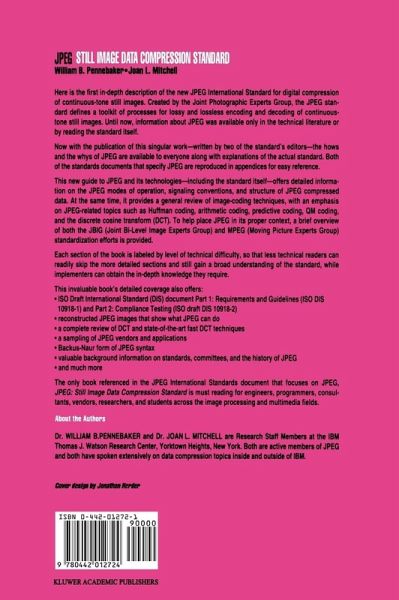 Foreword. Acknowledgments. Trademarks. Introduction. Image Concepts and Vocabulary. Aspects of the Human Visual Systems. The Discrete Cosine Transform (DCT). Image Compression Systems. JPEG Modes of Operation. JPEG Syntax and Data Organization. Entropy Coding Concepts. JPEG Binary Arithmetic Coding. JPEG Coding Models. JPEG Huffman Entropy Coding. Arithmetic Coding Statistical. More on Arithmetic Coding. Probability Estimation. Compression Performance. JPEG Enhancements. JPEG Applications and Vendors. Overview of CCITT, ISO, and IEC. History of JPEG. Other Image Compression Standards. Possible Future JPEG Directions. Appendix A. Appendix B. References. Index.