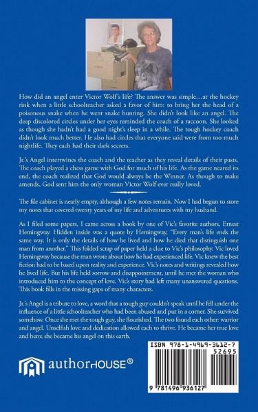 How did an angel enter Victor Wolf's life? The answer was simple...at the hockey rink when a little schoolteacher asked a favor of him: to bring her the head of a poisonous snake when he went snake hunting. She didn't look like an angel. The deep discolored circles under her eyes reminded the coach of a raccoon. She looked as though she hadn't had a good night's sleep in a while. The tough hockey coach didn't look much better. He also had circles that everyone said were from too much nightlife. They each had their dark secrets. Jr.'s Angel intertwines the coach and the teacher as they reveal details of their pasts. The coach played a chess game with God for much of his life. As the game neared its end, the coach realized that God would always be the Winner. As though to make amends, God sent him the only woman Victor Wolf ever really loved. The file cabinet is nearly empty, although a few notes remain. Now I had begun to store my notes that covered twenty years of my life and adventures with my husband. As I filed some papers, I came across a book by one of Vic's favorite authors, Ernest Hemingway. Hidden inside was a quote by Hemingway, "Every man's life ends the same way. It is only the details of how he lived and how he died that distinguish one man from another." This folded scrap of paper held a clue to Vic's philosophy. Vic loved Hemingway because the man wrote about how he had experienced life. Vic knew the best fiction had to be based upon reality and experience. Vic's notes and writings revealed how he lived life. But his life held sorrow and disappointment, until he met the woman who introduced him to the concept of love. Vic's story had left many unanswered questions. This book fills in the missing gaps of many characters. Jr.'s Angel is a tribute to love, a word that a tough guy couldn't speak until he fell under the influence of a little schoolteacher who had been abused and put in a corner. She survived somehow. Once she met the tough guy, she flourished. The two found each other: warrior and angel. Unselfish love and dedication allowed each to thrive. He became her true love and hero; she became his angel on this earth.