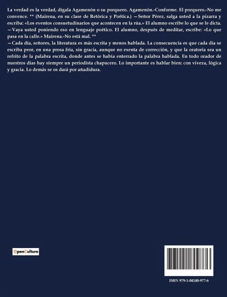 La verdad es la verdad, dígala Agamenón o su porquero. Agamenón.-Conforme. El porquero.-No me convence. ** (Mairena, en su clase de Retórica y Poética.) ¿Señor Pérez, salga usted a la pizarra y escriba: «Los eventos consuetudinarios que acontecen en la rúa.» El alumno escribe lo que se le dicta. ¿Vaya usted poniendo eso en lenguaje poético. El alumno, después de meditar, escribe: «Lo que pasa en la calle.» Mairena.-No está mal. ** ¿Cada día, señores, la literatura es más escrita y menos hablada. La consecuencia es que cada día se escriba peor, en una prosa fría, sin gracia, aunque no exenta de corrección, y que la oratoria sea un refrito de la palabra escrita, donde antes se había enterrado la palabra hablada. En todo orador de nuestros días hay siempre un periodista chapucero. Lo importante es hablar bien: con viveza, lógica y gracia. Lo demás se os dará por añadidura.