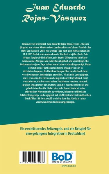 Eindrucksvoll beschreibt Juan Eduardo Rojas-Vásquez sein Leben als jüngstes von sieben Kindern eines Landarbeiters in der Nähe von Parral in Chile. Nur wenige Tage nach dem Militärpüutsch am 11.9.1973 findet seine unbeschwerte Kindheit ein jähes Ende. Sein Bruder Seergio wird inhaftiert, sein Bruder Gilberto und sein Vater werden von Polizisten verschleppt. Die Vorkommnisse jener Tage haben Juans Leben nachhaltig geprägt. Er engagiert sich in Aktivisten-Gruppen, stellt Nachforschungen an. Als sich die Lage zuspitzt, muss er Chile verlassen und emigriert nach Deutschland. Er ist entschlossen, das Beste aus seiner Situation zu machen, lernt mit großem Engagement die deutsche Sprache, fasst beruflich Fuß und gründet eine Familie. Dabei ist er sehr darauf bedacht, seine chilenischen Wurzeln nicht zu verlieren, leitet eine chilenische Folkloretanzgruppe und engagiert sich als interkultureller Mediator. Bis heute weiß er nichts über das Schicksal seiner verschwundenen Angehörigen.