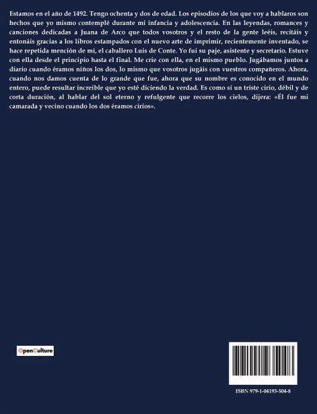 Estamos en el año de 1492. Tengo ochenta y dos de edad. Los episodios de los que voy a hablaros son hechos que yo mismo contemplé durante mi infancia y adolescencia. En las leyendas, romances y canciones dedicadas a Juana de Arco que todos vosotros y el resto de la gente leéis, recitáis y entonáis gracias a los libros estampados con el nuevo arte de imprimir, recientemente inventado, se hace repetida mención de mí, el caballero Luis de Conte. Yo fui su paje, asistente y secretario. Estuve con ella desde el principio hasta el final. Me crie con ella, en el mismo pueblo. Jugábamos juntos a diario cuando éramos niños los dos, lo mismo que vosotros jugáis con vuestros compañeros. Ahora, cuando nos damos cuenta de lo grande que fue, ahora que su nombre es conocido en el mundo entero, puede resultar increíble que yo esté diciendo la verdad. Es como si un triste cirio, débil y de corta duración, al hablar del sol eterno y refulgente que recorre los cielos, dijera: «Él fue mi camarada y vecino cuando los dos éramos cirios».