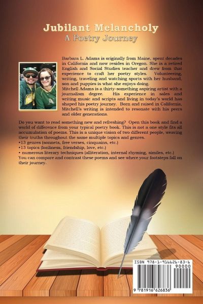 Barbara L. Adams is originally from Maine, spent decades in California and now resides in Oregon. She is a retired English and Social Studies teacher and drew from that experience to craft her poetry styles. Volunteering, writing, traveling and watching sports with her husband, son and puppies is what she enjoys doing. Mitchell Adams is a thirty-something aspiring artist with a journalism degree. His experience in sales and writing music and scripts and living in today's world has shaped his poetry journey. Born and raised in California, Mitchell's writing is intended to resonate with his peers and older generations. Do you want to read something new and refreshing? Open this book and find a world of difference from your typical poetry book. This is not a one style fits all accumulation of poems. This is a unique vision of two different people, weaving their truths throughout the same multiple topics and genres. *13 genres (sonnets, free verses, cinquains, etc.) *13 topics (lonliness, friendship, love, etc.) * numerous literary techniques (alliteration, internal rhyming, similes, etc.) You can compare and contrast these poems and see where your footsteps fall on their journey.