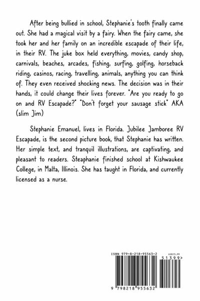 After being bullied in school, Stephanie's tooth finally came out. She had a magical visit by a fairy. When the fairy came, she took her and her family on an incredible escapade, of their life, in their RV. The juke box held everything, movies, candy shop, carnivals, beaches, arcade, fishing, surfing, golfing, horseback riding, casino's, racing, traveling, animals, anything you can think of. They even received shocking news. The decision was in their hands. It could change their lives forever. Jubilee Jamboree RV Escapade, is for the whole family. "Are you ready to go on an RV Escapade?" "Don't forget your sausage stick" AKA ( slim jim)