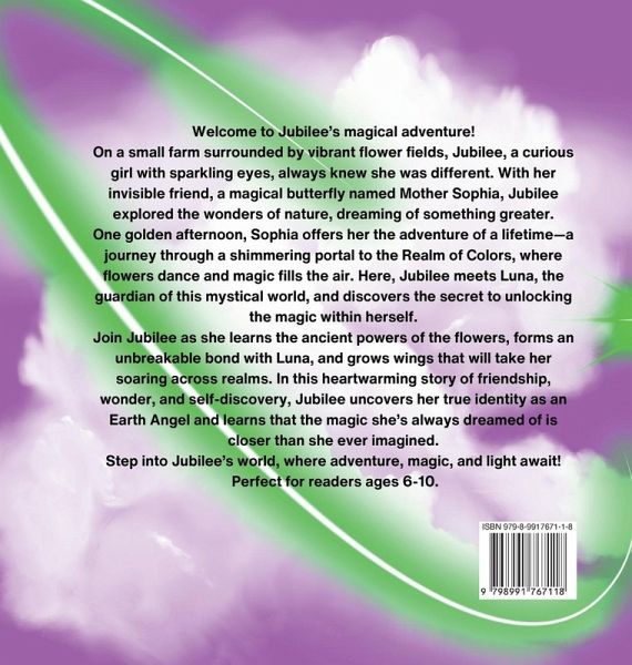 Welcome to Jubilee's magical adventure! On a small farm surrounded by vibrant flower fields, Jubilee, a curious girl with sparkling eyes, always knew she was different. With her invisible friend, a magical butterfly named Mother Sophia, Jubilee explored the wonders of nature, dreaming of something greater. One golden afternoon, Sophia offers her the adventure of a lifetime-a journey through a shimmering portal to the Realm of Colors, where flowers dance and magic fills the air. Here, Jubilee meets Luna, the guardian of this mystical world, and discovers the secret to unlocking the magic within herself. Join Jubilee as she learns the ancient powers of the flowers, forms an unbreakable bond with Luna, and grows wings that will take her soaring across realms. In this heartwarming story of friendship, wonder, and self-discovery, Jubilee uncovers her true identity as an Earth Angel and learns that the magic she's always dreamed of is closer than she ever imagined. Step into Jubilee's world, where adventure, magic, and light await! Perfect for readers ages 6-10.