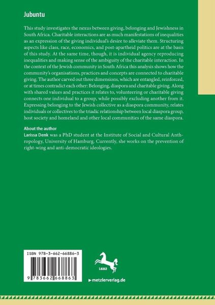 This study investigates the nexus between giving, belonging and Jewishness in South Africa. Charitable interactions are as much manifestations of inequalities as an expression of the giving individual's desire to alleviate them. Structuring aspects like class, race, economics, and post-apartheid politics are at the basis of this study. At the same time, though, it is individual agency reproducing inequalities and making sense of the ambiguity of the charitable interaction. In the context of the Jewish community in South Africa this analysis shows how the community's organisations, practices and concepts are connected to charitable giving. The author carved out three dimensions, which are entangled, reinforced, or at times contradict each other: Belonging, diaspora and charitable giving. Along with shared values and practices it relates to, volunteering or charitable giving connects one individual to a group, while possibly excluding another from it. Expressing belonging to the Jewish collective as a diaspora community, relates individuals or collectives to the triadic relationship between local diaspora group, host society and homeland and other local communities of the same diaspora.