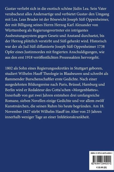Wilhelm Hauff: Jud Süß Lesefreundlicher Großdruck in 16-pt-Schrift Gustav verliebt sich in die exotisch schöne Jüdin Lea. Sein Vater verabscheut alles Andersartige und verbietet Gustav den Umgang mit Lea. Leas Bruder ist der Bösewicht Joseph Süß Oppenheimer, der mit Billigung seines Herrn Herzog Karl Alexander von Württemberg als Regierungsvertreter ein intrigantes Ausbeutungssystem gegen Gesetz und Anstand durchsetzt, bis der Herzog plötzlich verstirbt und Süß gehenkt wird. Historisch war der als Jud Süß diffamierte Joseph Süß Oppenheimer 1738 Opfer eines Justizmordes mit fingierten Anschuldigungen, wie aus den erst 1918 veröffentlichten Prozessakten hervorgeht. Großformat, 210 x 297 mm Berliner Ausgabe, 2020 Durchgesehener Neusatz mit einer Biographie des Autors bearbeitet und eingerichtet von Theodor Borken Erstdruck: 1827 im »Morgenblatt«. Textgrundlage ist die Ausgabe: Wilhelm Hauff: Sämtliche Werke in drei Bänden. Nach den Originaldrucken und Handschriften. Textredaktion und Anmerkungen Sibylle von Steinsdorff, München: Winkler, 1970. Umschlaggestaltung von Thomas Schultz-Overhage unter Verwendung des Bildes: Überhöhte Darstellung der Hinrichtung des Joseph Süß Oppenheimer am 4. Februar 1738 vor den Toren Stuttgarts. Gesetzt aus der Minion Pro, 16 pt. Über den Autor: 1802 als Sohn eines Regierungssekretärs in Stuttgart geboren, studiert Wilhelm Hauff Theologie in Blaubeuren und schreibt als flammender Burschenschaftler erste Gedichte. Nach einer ausgedehnten Bildungsreise nach Paris, Brüssel, Hamburg und Berlin wird er Redakteur des Cotta'schen »Morgenblattes«. Innerhalb von gut zwei Jahren entstehen drei umfangreiche Romane, sieben Novellen einige Gedichte und vor allem zwölf Kunstmärchen, die seinen Ruhm bis heute begründen. Am 18. November 1827 stirbt Wilhelm Hauff im Alter von 25 Jahren innerhalb weniger Tage an einer Infektionskrankheit.
