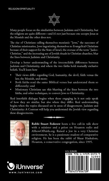 Many people focus on the similarities between Judaism and Christianity, but the religions are quite different-and it's not just because one accepts Jesus as the messiah and the other does not. The rise of Christians calling themselves messianic "Jews," the successes of Christian missionaries, Jews ingratiating themselves to Evangelical Christians because of their support for the State of Israel, the overuse of the term "Judeo-Christian," and the increasing use of Jewish rituals in Christian churches, blur the lines between Judaism and Christianity. Develop a better understanding of the irreconcilable differences between Judaism and Christianity, and where the two faiths hold mutually exclusive beliefs. You'll learn how ¿ Their views differ regarding God, humanity, the devil, faith versus the law, the Messiah, and more; ¿ Both faiths read the same Biblical verses but understand them so differently; and ¿ Missionary Christians use this blurring of the lines between the two faiths, and other techniques, to convert Jews to Christianity. Real interfaith dialogue begins when those engaging in it not only speak of how they are similar, but also where they differ. Real understanding begins when the topics discussed are in areas of disagreement. Judaism and Christianity: A Contrastwill help you understand the Jewish view of these disagreements.