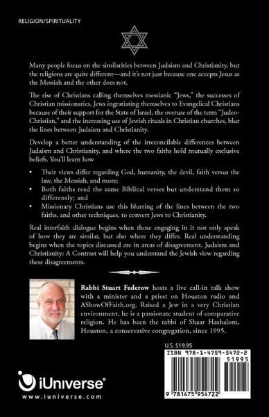 Many people focus on the similarities between Judaism and Christianity, but the religions are quite different-and it's not just because one accepts Jesus as the messiah and the other does not. The rise of Christians calling themselves messianic "Jews," the successes of Christian missionaries, Jews ingratiating themselves to Evangelical Christians because of their support for the State of Israel, the overuse of the term "Judeo-Christian," and the increasing use of Jewish rituals in Christian churches, blur the lines between Judaism and Christianity. Develop a better understanding of the irreconcilable differences between Judaism and Christianity, and where the two faiths hold mutually exclusive beliefs. You'll learn how ¿ Their views differ regarding God, humanity, the devil, faith versus the law, the Messiah, and more; ¿ Both faiths read the same Biblical verses but understand them so differently; and ¿ Missionary Christians use this blurring of the lines between the two faiths, and other techniques, to convert Jews to Christianity. Real interfaith dialogue begins when those engaging in it not only speak of how they are similar, but also where they differ. Real understanding begins when the topics discussed are in areas of disagreement. Judaism and Christianity: A Contrastwill help you understand the Jewish view of these disagreements.