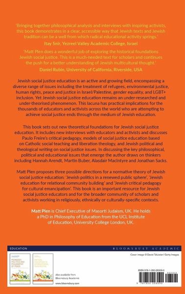This book sets out new theoretical foundations for Jewish social justice education by surveying and discussing Freirean critical pedagogy, Catholic models of social justice education, Jewish social justice literature and interviews with educators and activists. Jewish social justice education is an active and growing field, encompassing a diverse range of issues including the treatment of refugees, environmental justice, human rights, peace and justice in Israel/Palestine, gender equality, and LGBT+ inclusion. Yet Jewish social justice education remains an under-researched and under-theorized phenomenon. This lacuna has practical implications for the thousands of educators and activists across the world who are attempting to achieve social justice ends through the medium of Jewish education. In discussing the key philosophical, political and educational issues that emerge when discussing these topics, the author draws on thinkers including Hannah Arendt, Martin Buber, Alasdair MacIntyre and Jonathan Sacks. Matt Plen proposes three possible directions for a normative theory of Jewish social justice education: 'Jewish politics in a renewed public sphere', 'Jewish education for relational community building' and 'Jewish critical pedagogy for cultural emancipation'.