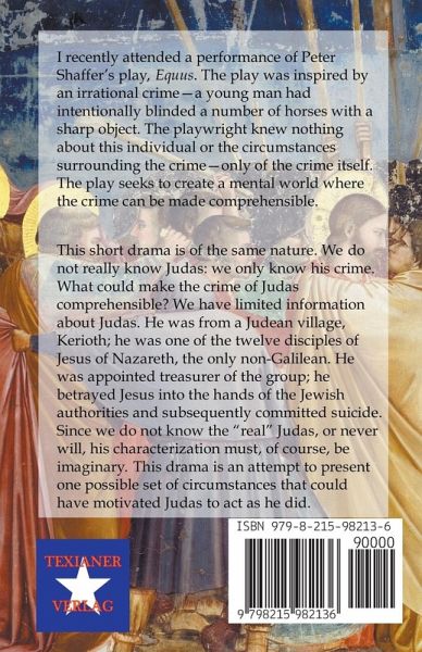 I recently attended a performance of Peter Shaffer's play, Equus. The play was inspired by an irrational crime-a young man had intentionally blinded a number of horses with a sharp object. The playwright knew nothing about this individual or the circumstances surrounding the crime-only of the crime itself. The play seeks to create a mental world where the crime can be made comprehensible. This short drama is of the same nature. We do not really know Judas: we only know his crime. What could make the crime of Judas comprehensible? We have limited information about Judas. He was from a Judean village, Kerioth; he was one of the twelve disciples of Jesus of Nazareth, the only non-Galilean. He was appointed treasurer of the group; he betrayed Jesus into the hands of the Jewish authorities and subsequently committed suicide. Since we do not know the "real" Judas, or never will, his characterization must, of course, be imaginary. This drama is an attempt to present one possible set of circumstances that could have motivated Judas to act as he did.