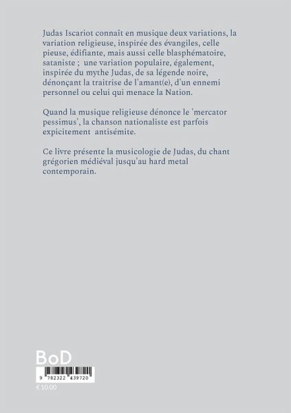 Judas Iscariot connaît en musique deux variations, la variation religieuse, pieuse mais aussi sataniste, inspirée des évangiles, mais aussi une variation populaire, inspirée du mythe, propice à dénoncer la traitrise de l'amant(e), de l'ennemi personnel ou de la France. Ce livre présente la musicologie de Judas du chant grégorien médiéval jusqu'au hard metal contemporain.