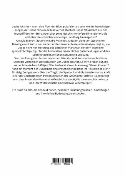 Judas Iskariot - kaum eine Figur der Bibel polarisiert so sehr wie der berüchtigte Jünger, der Jesus mit einem Kuss verriet. Doch ist Judas tatsächlich nur der Inbegriff des Verräters, oder birgt seine Geschichte tiefere Dimensionen, die weit über die scheinbar eindeutige Handlung hinausgehen?Ottavio Bianchi lädt uns ein, die Rolle des Judas im Licht von Geschichte, Theologie und Kultur neu zu betrachten. In einer fesselnden Analyse zeigt er, wie Judas nicht nur Werkzeug des göttlichen Plans war, sondern auch eine symbolträchtige Figur für die Ambivalenz menschlicher Entscheidungen und das Spannungsfeld zwischen Schuld und Erlösung.Von den Evangelien bis zur modernen Literatur und Kunst untersucht dieses Buch die vielfältigen Darstellungen von Judas Iskariot. Es wirft Fragen auf, die uns noch heute beschäftigen: Was bedeutet Verrat in einem größeren Kontext? Kann ein Moment der Dunkelheit eine entscheidende Rolle im Heilsplan spielen?Ein tiefgründiges Werk über die Tragik, die Symbolik und die transformative Kraft einer der umstrittensten Persönlichkeiten der Geschichte. Ottavio Bianchi zeigt uns, dass hinter dem Verrat eine Geschichte steckt, die die menschliche Natur und ihre Widersprüche eindrucksvoll widerspiegelt.Ein Buch für alle, die den Mut haben, bekannte Erzählungen neu zu hinterfragen und ihre tiefere Bedeutung zu entdecken.