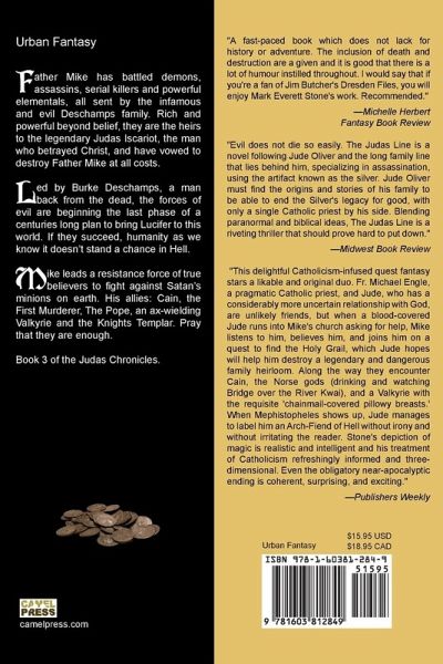 Father Mike has battled demons, assassins, serial killers and powerful elementals, all sent by the inframous and evil Deschamps family. Rich and powerful beyoind belief, they are the heirs to the legendary Judas Iscariot, the man who betrayed Christ , and have vowed to destroy Father Mike at all costs. Led by Burke Deschamps, a man back from the dead, the forces of evil are beginning the last phase of a centuries long plan to bring Lucifer to this world, If they succeed, humanity as we know it won't stand a chance in Hell. Mike leads a resistance force of true believers to fight against Satan's minions on earth. His allies: Cain, the First Murderer, The Pope, an ax-wielding Valkyrie and the Knights Templar. Pray that they are enough.
