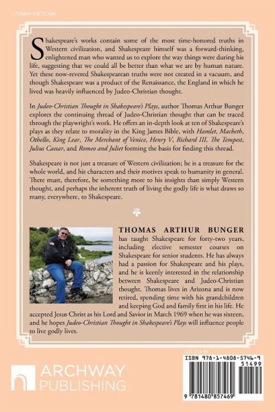 Shakespeares works contain some of the most time-honored truths in Western civilization, and Shakespeare himself was a forward-thinking, enlightened man who wanted us to explore the way things were during his life, suggesting that we could all be better than what we are by human nature. Yet these now-revered Shakespearean truths were not created in a vacuum, and though Shakespeare was a product of the Renaissance, the England in which he lived was heavily influenced by Judeo-Christian thought. In Judeo-Christian Thought in Shakespeares Plays, author Thomas Arthur Bunger explores the continuing thread of Judeo-Christian thought that can be traced through the playwrights work. He offers an in-depth look at ten of Shakespeares plays as they relate to morality in the King James Bible, with Hamlet, Macbeth, Othello, King Lear, The Merchant of Venice, Henry V, Richard III, The Tempest, Julius Caesar, and Romeo and Juliet forming the basis for finding this thread. Shakespeare is not just a treasure of Western civilization; he is a treasure for the whole world, and his characters and their motives speak to humanity in general. There must, therefore, be something more to his insights than simply Western thought, and perhaps the inherent truth of living the godly life is what draws so many, everywhere, to Shakespeare.