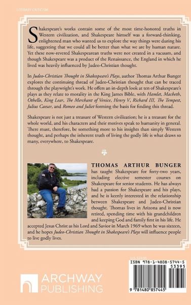 Shakespeares works contain some of the most time-honored truths in Western civilization, and Shakespeare himself was a forward-thinking, enlightened man who wanted us to explore the way things were during his life, suggesting that we could all be better than what we are by human nature. Yet these now-revered Shakespearean truths were not created in a vacuum, and though Shakespeare was a product of the Renaissance, the England in which he lived was heavily influenced by Judeo-Christian thought. In Judeo-Christian Thought in Shakespeares Plays, author Thomas Arthur Bunger explores the continuing thread of Judeo-Christian thought that can be traced through the playwrights work. He offers an in-depth look at ten of Shakespeares plays as they relate to morality in the King James Bible, with Hamlet, Macbeth, Othello, King Lear, The Merchant of Venice, Henry V, Richard III, The Tempest, Julius Caesar, and Romeo and Juliet forming the basis for finding this thread. Shakespeare is not just a treasure of Western civilization; he is a treasure for the whole world, and his characters and their motives speak to humanity in general. There must, therefore, be something more to his insights than simply Western thought, and perhaps the inherent truth of living the godly life is what draws so many, everywhere, to Shakespeare.