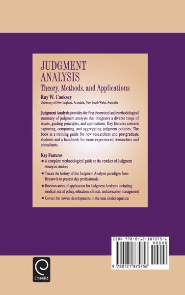 Provides the theoretical and methodological summary of judgment analysis that integrates a diverse range of issues, guiding principles, and applications. This work traces the history of the judgment analysis paradigm from Brunswik. It is a methodological guide to the conduct of judgment analysis studies.