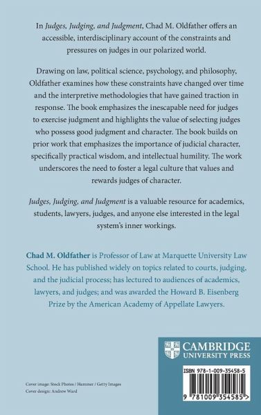 In Judges, Judging, and Judgment, Chad M. Oldfather offers an accessible, interdisciplinary account of the constraints and pressures on judges in our polarized world. Drawing on law, political science, psychology, and philosophy, Oldfather examines how these constraints have changed over time and the interpretive methodologies that have gained traction in response. The book emphasizes the inescapable need for judges to exercise judgment and highlights the value of selecting judges who possess good judgment and character. The book builds on prior work that emphasizes the importance of judicial character, specifically practical wisdom, and intellectual humility. The work underscores the need to foster a legal culture that values and rewards judges of character. Judges, Judging, and Judgment is a valuable resource for academics, students, lawyers, judges, and anyone else interested in the legal system's inner workings.