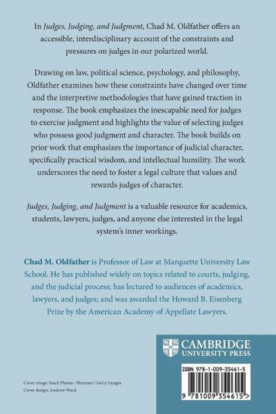 In Judges, Judging, and Judgment, Chad M. Oldfather offers an accessible, interdisciplinary account of the constraints and pressures on judges in our polarized world. Drawing on law, political science, psychology, and philosophy, Oldfather examines how these constraints have changed over time and the interpretive methodologies that have gained traction in response. The book emphasizes the inescapable need for judges to exercise judgment and highlights the value of selecting judges who possess good judgment and character. The book builds on prior work that emphasizes the importance of judicial character, specifically practical wisdom, and intellectual humility. The work underscores the need to foster a legal culture that values and rewards judges of character. Judges, Judging, and Judgment is a valuable resource for academics, students, lawyers, judges, and anyone else interested in the legal system's inner workings.