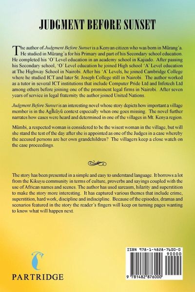 Judgment before sunset is an interesting novel whose story depicts how important a village member is in the Agikuyu context especially when one goes missing. The novel further narrates how cases were heard and determined in one of the villages in Mt. Kenya region. The entire village is rocked with great fear because of the repellant kidnappings. Murugu is an ambitious and stubborn boy and nothing will stop him from getting whatever his heart desires regardless of the prevailing circumstance and his disciplinarian mother. Mmbi, a respected woman is considered to be the wisest woman in the village but will she stand the test of the day after she is appointed as one of the Judges in a case whereby the accused persons are her own grandchildren? The villagers keep a close watch on the case proceedings. The story has been presented in a simple and easy to understand language. It borrows a lot from the Kikuyu community in terms of culture, proverbs and sayings coupled with the use of African names and scenes. The author has used sarcasm, hilarity and superstition to make the story more interesting. It has captured various themes that include crime, superstition, hard work, discipline and indiscipline. Because of the episodes, dramas and scenarios featured in the story the reader's fingers will keep on turning pages wanting to know what will happen next.