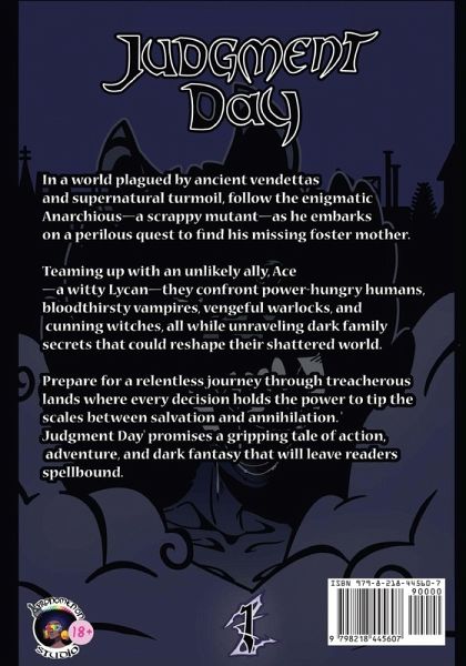 "Judgment Day," a captivating dark fantasy comic book that will transport you to a dystopian world filled with mutants, werewolves, vampires, and witches. Follow the gripping journey of Anarchious, a desperate son searching for his foster mother, as he navigates through a landscape ravaged by genocide and haunted by inner demons. As Anarchious embarks on his quest, he encounters a cast of intriguing characters, including the blood pack vampyr gang leader, Blaine. Experience the tension and drama as Anarchious confronts Blaine in an epic battle t¿hat will determine the fate of their world. Filled with themes of redemption, betrayal, and revenge, "Judgment Day" offers readers a thrilling adventure that explores the depths of human nature and the power of resilience. Get ready for an action-packed ride as Anarchious and his allies face off against formidable foes, uncover family secrets, and fight for survival in a world where hope is a precious commodity. Join the journey and discover a richly imagined universe brimming with mythical creatures, epic battles, and unexpected twists. "Judgment Day" is a must-read for fans of dark fantasy looking for a compelling story that will keep them on the edge of their seats until the very end.