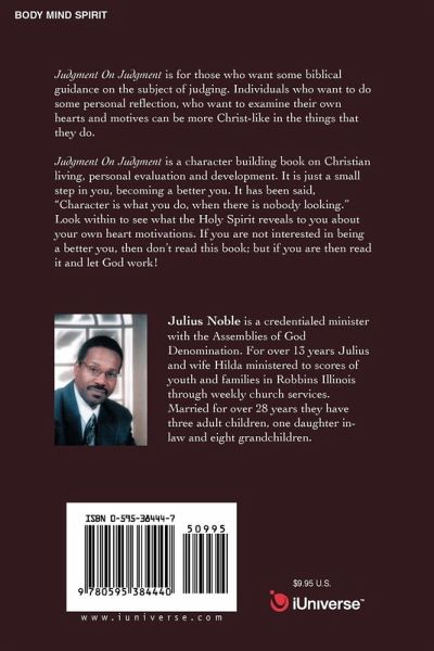 Judgment On Judgment is for those who want some biblical guidance on the subject of judging. Individuals who want to do some personal reflection, who want to examine their own hearts and motives can be more Christ-like in the things that they do. Judgment On Judgment is a character building book on Christian living, personal evaluation and development. It is just a small step in you, becoming a better you. It has been said, 'Character is what you do, when there is nobody looking." Look within to see what the Holy Spirit reveals to you about your own heart motivations. If you are not interested in being a better you, then don't read this book; but if you are then read it and let God work!
