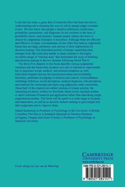 The thirty-five chapters in this book describe various judgmental heuristics and the biases they produce, not only in laboratory experiments but in important social, medical, and political situations as well. Individual chapters discuss the representativeness and availability heuristics, problems in judging covariation and control, overconfidence, multistage inference, social perception, medical diagnosis, risk perception, and methods for correcting and improving judgments under uncertainty. About half of the chapters are edited versions of classic articles; the remaining chapters are newly written for this book. Most review multiple studies or entire subareas of research and application rather than describing single experimental studies. This book will be useful to a wide range of students and researchers, as well as to decision makers seeking to gain insight into their judgments and to improve them.