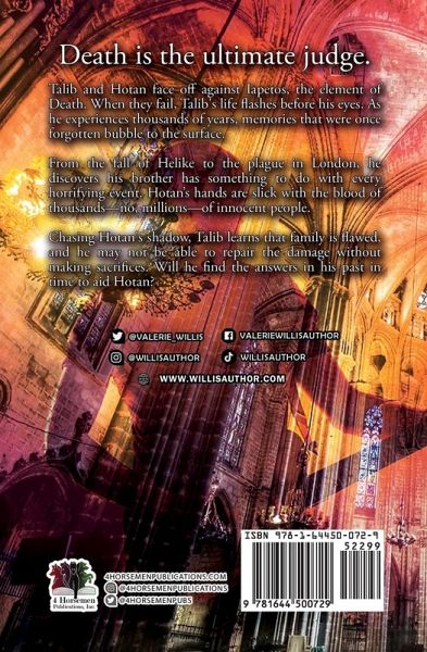 Death is the ultimate judge. Talib and Hotan face off against Iapetos, the element of Death. When they fail, Talib's life flashes before his eyes. As he experiences thousands of years, memories that were once forgotten bubble to the surface. From the fall of Helike to the plague in London, he discovers his brother has something to do with every horrifying event. Hotan's hands are slick with the blood of thousands-no, millions-of innocent people. Chasing Hotan's shadow, Talib learns that family is flawed, and he may not be able to repair the damage without making sacrifices. Will he find the answers in his past in time to aid Hotan?