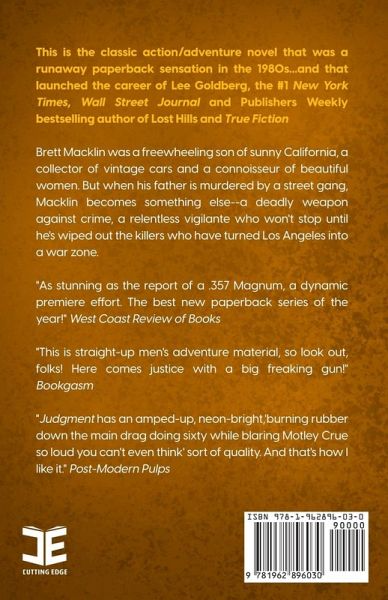 JUDGMENT is the classic action/adventure novel that was a runaway paperback sensation in the 1980s...and that skyrocked the career of Lee Goldberg, the #1 New York Times, Wall Street Journal and Publishers Weekly bestselling author of True Fiction, Lost Hills, fifteen Adrian Monk novels, and the first five, globally bestselling Fox & O'Hare novels with Janet Evanovich. Brett Macklin was a freewheeling son of sunny California, a collector of vintage cars and a connoisseur of beautiful women. But when his father is murdered by a street gang, Macklin becomes something else--a deadly weapon against crime, a relentless vigilante who won't stop until he's wiped out the killers who have turned Los Angeles into a war zone. "As stunning as the report of a .357 Magnum, a dynamic premiere effort [...] The Best New Paperback Series of the year!" West Coast Review of Books (Originally published as the first book in the ".357 Vigilante" series, under the pen name Ian Ludlow.) Other books in the series: ADJOURNED, PAYBACK, and GUILTY ABOUT THE AUTHOR Lee Goldberg is a two-time Edgar & two-time Shamus Award nominee and the #1 New York Times bestselling author of over thirty novels, including the Wall Street Journal bestseller True Fiction, three Eve Ronin novels (Lost Hills, Bone Canyon and Gated Prey), fifteen Monk mysteries and the first five internationally bestselling Fox & O'Hare books (The Heist, The Chase, The Job, The Scam, The Pursuit ) co-written with Janet Evanovich. He's also written and/or produced scores of TV shows, including Diagnosis Murder, SeaQuest, Monk, and The Glades and is the co-creator of the hit Hallmark Mystery Movie series Mystery 101. As an international television consultant, he has advised networks and studios in Canada, France, Germany, Spain, China, Sweden, and the Netherlands on the creation, writing and production of episodic television series. He is also the cofounder of the publishing company Brash Books.