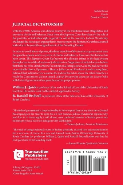 American society has undergone a revolution within a revolution. Until the 1960s, America was a liberal country in the traditional sense of legislative and executive checks and balances. Since then, the Supreme Court has taken on the role of the protector of individual rights against the will of the majority by creating, in a series of decisions, new rights for criminal defendants, atheists, homosexuals, illegal aliens, and others. Repeatedly, on a variety of cases, the Court has overturned the actions of local police or state laws under which local officials are acting. The result, according to Quirk and Birdwell, is freedom for the lawless and oppression for the law abiding. 'Judicial Dictatorship' challenges the status quo, arguing that in many respects the Supreme Court has assumed authority far beyond the original intent of the Founding Fathers. In order to avoid abuse of power, the three branches of the American government were designed to operate under a system of checks and balances. However, this balance has been upset. The Supreme Court has become the ultimate arbiter in the legal system through exercise of the doctrine of judicial review, which allows the court to invalidate any state or federal law it considers inconsistent with the constitution. Supporters of judicial review believe that there has to be a final arbiter of constitutional interpretation, and the Judiciary is the most suitable choice. Opponents, Thomas Jefferson and Abraham Lincoln among them, believed that judicial review assumes the judicial branch is above the other branches, a result the Constitution did not intend. The democratic paradox is that the majority in America agreed to limit its own power. Jefferson believed that the will of the majority must always prevail. His faith in the common man led him to advocate a weak national government, one that derived its power from the people. Alexander Hamilton, often Jefferson's adversary, lacking such faith, feared "the amazing violence and turbulence of the democratic spirit." This led him to believe in a strong national government, a social and economic aristocracy, and finally, judicial review. This conflict has yet to be resolved. 'Judicial Dictatorship' discusses the issue of who will decide if government has gone beyond its proper powers. That issue, in turn, depends on whether the Jeffersonian or Hamiltonian view of the nature of the person prevails. In challenging customary ideological alignments of conservative and liberal doctrine, 'Judicial Dictatorship' will be of interest to students and professionals in law, political scientists, and those interested in U.S. history.