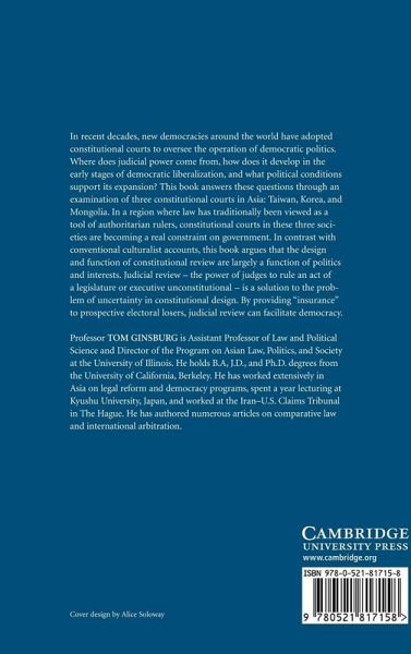 New democracies around the world have adopted constitutional courts to oversee the operation of democratic politics. Where does judicial power come from, how does it develop in the early stages of democratic liberalization, and what political conditions support its expansion? This book answers these questions through an examination of three constitutional courts in Asia: Taiwan, Korea, and Mongolia. In a region that has traditionally viewed law as a tool of authoritarian rulers, constitutional courts in these three societies are becoming a real constraint on government. In contrast with conventional culturalist accounts, this book argues that the design and functioning of constitutional review are largely a function of politics and interests. Judicial review - the power of judges to rule an act of a legislature or national leader unconstitutional - is a solution to the problem of uncertainty in constitutional design. By providing 'insurance' to prospective electoral losers, judicial review can facilitate democracy.
