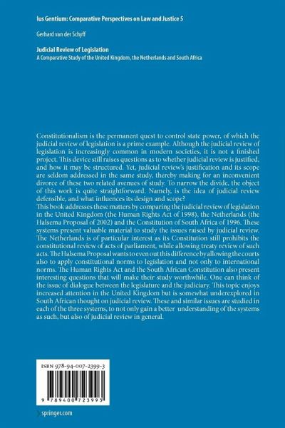 Constitutionalism is the permanent quest to control state power, of which the judicial review of legislation is a prime example. Although the judicial review of legislation is increasingly common in modern societies, it is not a finished project. This device still raises questions as to whether judicial review is justified, and how it may be structured. Yet, judicial review's justification and its scope are seldom addressed in the same study, thereby making for an inconvenient divorce of these two related avenues of study. To narrow the divide, the object of this work is quite straightforward. Namely, is the idea of judicial review defensible, and what influences its design and scope?This book addresses these matters by comparing the judicial review of legislation in the United Kingdom (the Human Rights Act of 1998), the Netherlands (the Halsema Proposal of 2002) and the Constitution of South Africa of 1996. These systems present valuable material to study the issues raised by judicial review. The Netherlands is of particular interest as its Constitution still prohibits the constitutional review of acts of parliament, while allowing treaty review of such acts. The Halsema Proposal wants to even out this difference by allowing the courts also to apply constitutional norms to legislation and not only to international norms. The Human Rights Act and the South African Constitution also present interesting questions that will make their study worthwhile. One can think of the issue of dialogue between the legislature and the judiciary. This topic enjoys increased attention in the United Kingdom but is somewhat underexplored in South African thought on judicial review. These and similar issues are studied in each of the three systems, to not only gain a better understanding of the systems as such, but also of judicial review in general.
