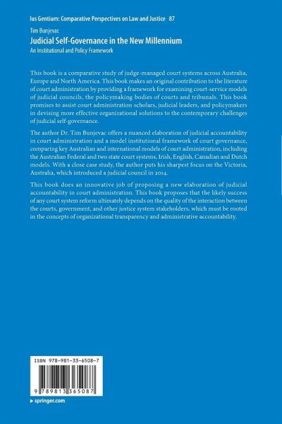 The author Dr. Tim Bunjevac offers a nuanced elaboration of judicial accountability in court administration and a model institutional framework of court governance, comparing key Australian and international models of court administration, including the Australian Federal and two state court systems, Irish, English, Canadian and Dutch models. With a close case study, the author puts his sharpest focus on the Victoria, Australia, which introduced a judicial council in 2014.