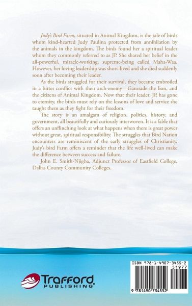 Judy's Bird Farm, situated in Animal Kingdom, is the tale of birds whom kind-hearted Judy Paulina protected from annihilation by the animals in the kingdom. The birds found her a spiritual leader whom they commonly referred to as JP. She shared her belief in the all-powerful, miracle-working, supreme-being called Maha-Waa. However, her loving leadership was short-lived and she died suddenly soon after becoming their leader. As the birds struggled for their survival, they became embroiled in a bitter conflict with their arch-enemy-Gatorade the lion, and the citizens of Animal Kingdom. Now that their leader, JP, has gone to eternity, the birds must rely on the lessons of love and service she taught them as they fight for their freedom. The story is an amalgam of religion, politics, history, and government, all beautifully and curiously interwoven. It is a fable that offers an unflinching look at what happens when there is great power without great, spiritual responsibility. The struggles that Bird Nation encounters are reminiscent of the early struggles of Christianity. Judy's bird Farm offers a reminder that the life well-lived can make the difference between success and failure. John E. Smith-Njigba, Adjunct Professor of Eastfield College, Dallas County Community Colleges.