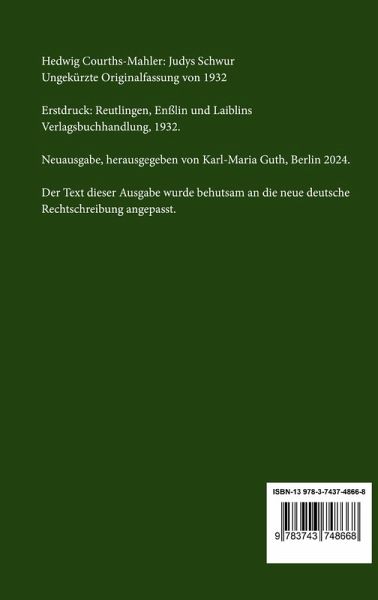 Hedwig Courths-Mahler: Judys Schwur. Ungekürzte Originalfassung von 1932 Erstdruck: Reutlingen, Enßlin und Laiblins Verlagsbuchhandlung, 1932. Neuausgabe, herausgegeben von Karl-Maria Guth, Berlin 2024. Der Text dieser Ausgabe wurde behutsam an die neue deutsche Rechtschreibung angepasst. Gesetzt aus der Minion Pro, 11 pt. Henricus - Edition Deutsche Klassik GmbH