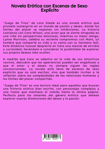 "Juego de Tríos" de Lara Steele es una novela erótica que promete sumergirte en un mundo de pasión y deseo, donde los límites del placer se exploran sin inhibiciones. La historia comienza con Cara Wilson, una joven que se siente atrapada en una vida sin perspectivas amorosas, mientras su mejor amiga, Lynne Morrison, celebra su reciente compromiso con Mark, un hombre que comparte su vida y su cama con su hermano Ash. Esta dinámica inusual despierta en Cara una mezcla de envidia y curiosidad, llevándola a considerar la posibilidad de explorar sus propios deseos más ocultos.A medida que Cara se adentra en la vida de sus atractivos vecinos, descubre que las apariencias pueden ser engañosas y que el amor y el deseo no siempre siguen las reglas convencionales. La novela está llena de escenas de sexo explícito que no solo excitan, sino que también invitan a la reflexión sobre las complejidades de las relaciones humanas y los límites del placer compartido."Juego de Tríos" es una lectura ideal para aquellos que buscan una historia erótica bien escrita, con personajes complejos y una trama que mantiene el interés hasta la última página. Perfecta para los amantes del género erótico que desean explorar nuevas dimensiones del deseo y la pasión.