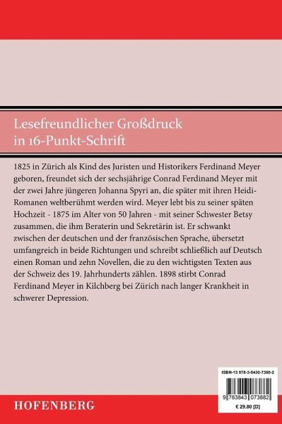 Conrad Ferdinand Meyer: Jürg Jenatsch. Eine Bündnergeschichte Lesefreundlicher Großdruck in 16-pt-Schrift Erstdruck unter dem Titel »Georg Jenatsch. Eine Geschichte aus der Zeit des Dreißigjährigen Krieges« in: Die Literatur (Leipzig), 2. Jg., 1874. Hier in der Fassung von 1882. Vollständige Neuausgabe. Großformat, 210 x 297 mm Herausgegeben von Karl-Maria Guth. Berlin 2015. Textgrundlage ist die Ausgabe: Conrad Ferdinand Meyer: Sämtliche Werke in zwei Bänden. Vollständiger Text nach den Ausgaben letzter Hand. Mit einem Nachwort von Erwin Laaths, München: Winkler, 1968. Umschlaggestaltung von Thomas Schultz-Overhage unter Verwendung des Bildes: »Conny«, Tim Tempelhofer, 2015. Über den Autor: 1825 in Zürich als Kind des Juristen und Historikers Ferdinand Meyer geboren, freundet sich der sechsjährige Conrad Ferdinand Meyer mit der zwei Jahre jüngeren Johanna Spyri an, die später mit ihren Heidi-Romanen weltberühmt werden wird. Meyer lebt bis zu seiner späten Hochzeit - 1875 im Alter von 50 Jahren - mit seiner Schwester Betsy zusammen, die ihm Beraterin und Sekretärin ist. Er schwankt zwischen der deutschen und der französischen Sprache, übersetzt umfangreich in beide Richtungen und schreibt schließlich auf Deutsch einen Roman und zehn Novellen, die zu den wichtigsten Texten aus der Schweiz des 19. Jahrhunderts zählen. 1898 stirbt Conrad Ferdinand Meyer in Kilchberg bei Zürich nach langer Krankheit in schwerer Depression.
