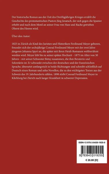Conrad Ferdinand Meyer: Jürg Jenatsch. Eine Bündnergeschichte Der historische Roman aus der Zeit des Dreißigjährigen Krieges erzählt die Geschichte des protestantischen Pastors Jürg Jenatsch, der sich gegen die Spanier erhebt und nach dem Mord an seiner Frau von Hass und Rache getrieben Oberst des Heeres wird. Erstdruck unter dem Titel »Georg Jenatsch. Eine Geschichte aus der Zeit des Dreißigjährigen Krieges« in: Die Literatur (Leipzig), 2. Jg., 1874. Hier in der Fassung von 1882. Vollständige Neuausgabe mit einer Biographie des Autors. Herausgegeben von Karl-Maria Guth. Berlin 2013. Textgrundlage ist die Ausgabe: Conrad Ferdinand Meyer: Sämtliche Werke in zwei Bänden. Vollständiger Text nach den Ausgaben letzter Hand. Mit einem Nachwort von Erwin Laaths, München: Winkler, 1968. Die Paginierung obiger Ausgabe wird in dieser Neuausgabe als Marginalie zeilengenau mitgeführt. Umschlaggestaltung von Thomas Schultz-Overhage unter Verwendung des Bildes: Unbekannter Maler, Georg Jenatsch, 1636. Gesetzt aus Minion Pro, 11 pt. Über den Autor: 1825 in Zürich als Kind des Juristen und Historikers Ferdinand Meyer geboren, freundet sich der sechsjährige Conrad Ferdinand Meyer mit der zwei Jahre jüngeren Johanna Spyri an, die später mit ihren Heidi-Romanen weltberühmt werden wird. Meyer lebt bis zu seiner späten Hochzeit - 1875 im Alter von 50 Jahren - mit seiner Schwester Betsy zusammen, die ihm Beraterin und Sekretärin ist. Er schwankt zwischen der deutschen und der französischen Sprache, übersetzt umfangreich in beide Richtungen und schreibt schließlich auf Deutsch einen Roman und zehn Novellen, die zu den wichtigsten Texten aus der Schweiz des 19. Jahrhunderts zählen. 1898 stirbt Conrad Ferdinand Meyer in Kilchberg bei Zürich nach langer Krankheit in schwerer Depression.